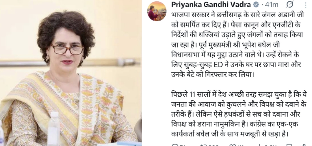 प्रियंका गांधी ने एक्स पर पोस्ट किया, ‘भाजपा सरकार ने छत्तीसगढ़ के सारे जंगल अदाणी जी को समर्पित कर दिए हैं। पेसा कानून और एनजीटी के निर्देशों की धज्जियां उड़ाते हुए जंगलों को तबाह किया जा रहा है। पूर्व मुख्यमंत्री भूपेश बघेल जी विधानसभा में यह मुद्दा उठाने वाले थे। उन्हें रोकने के लिए सुबह-सुबह ईडी ने उनके घर पर छापा मारा और उनके बेटे को गिरफ्तार कर लिया। ‘ उन्होंने दावा किया कि पिछले 11 वर्षों में देश अच्छी तरह समझ चुका है कि ये जनता की आवाज को कुचलने और विपक्ष को दबाने के तरीके हैं, लेकिन ऐसे हथकंडों से सच को दबाना और विपक्ष को डराना नामुमकिन है। प्रियंका गांधी ने कहा, ‘कांग्रेस का एक-एक कार्यकर्ता बघेल जी के साथ मजबूती से खड़ा है।’