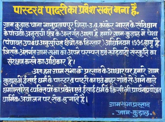 गांव की सीमाओं पर अब ऐसे बोर्ड लगाए गए हैं जिनमें स्पष्ट रूप से लिखा गया है – “इस गांव में पास्टर और पादरी का प्रवेश वर्जित है।” बोर्ड पर संविधान के प्रावधानों, विशेषकर पंचायत (अनुसूचित क्षेत्र पर विस्तार) अधिनियम – PESA कानून का भी उल्लेख किया गया है।