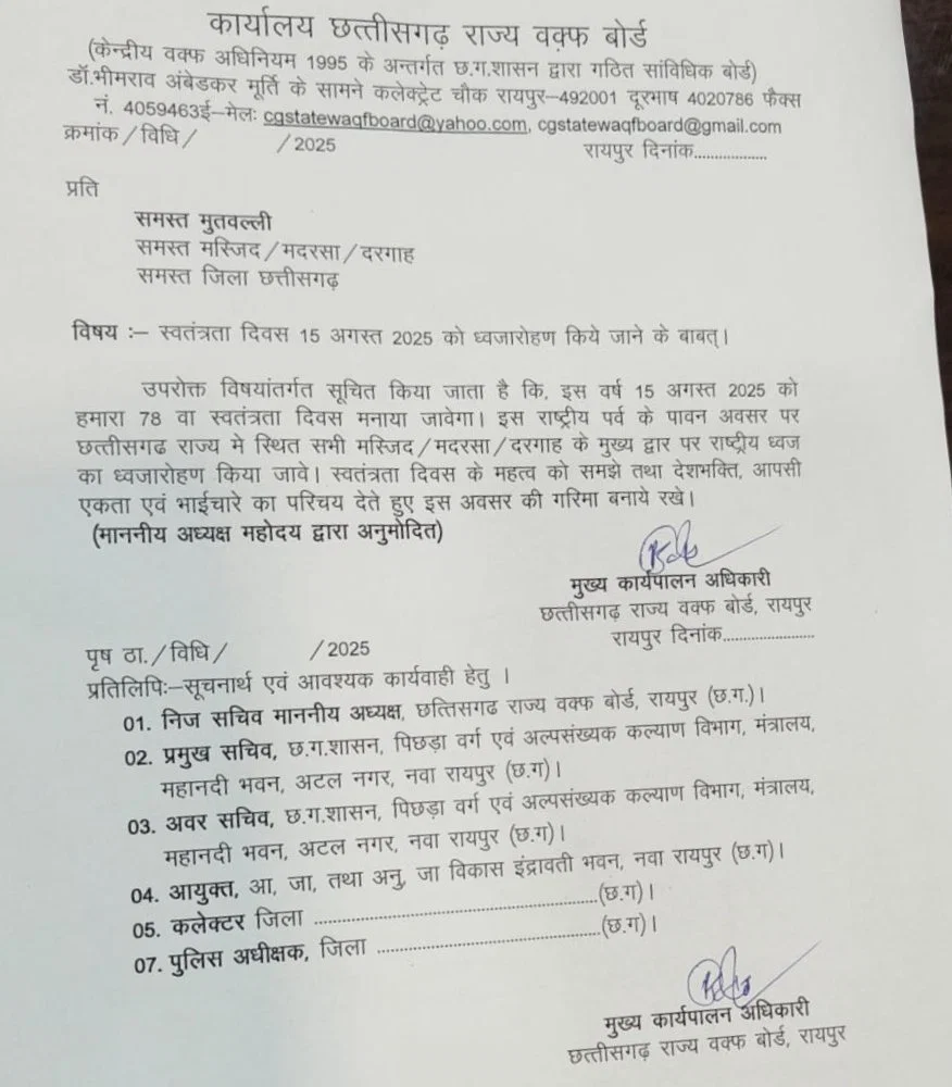 छत्तीसगढ़/रायपुर : छत्तीसगढ़ राज्य वक्फ बोर्ड ने 15 अगस्त 2025 को स्वतंत्रता दिवस के मौके पर राज्य के सभी मस्जिद, मदरसा और दरगाहों में राष्ट्रीय ध्वज फहराने का आग्रह किया है। वक्फ बोर्ड के कार्यालय से जारी संदेश में कहा गया है कि स्वतंत्रता दिवस एक पवित्र अवसर है और इसे सभी धार्मिक स्थलों पर राष्ट्रीय ध्वज फहराकर मनाना चाहिए। बोर्ड ने इस दिन को देशभक्ति, एकता और भाईचारे का प्रतीक बनाने पर जोर दिया है।
