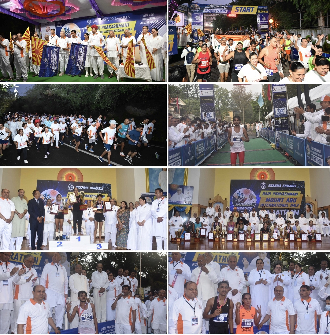 आबूरोड। 7वीं दादी प्रकाशमणि आबू इंटरनेशनल हाफ मैराथन में रविवार को सात देशों के 2700 धावकों ने आबूरोड से माउंट आबू के लिए 21.9 किमी की दौड़ लगाई। मैराथन के नियत समय साढ़े तीन घंटे की अवधि में दो हजार धावक फिनिशिंग पाइंट तक पहुंचे। वहीं 700 धावक आधी दौड़ ही पूरी कर पाए। ब्रह्माकुमारीज़ संस्थान की पूर्व मुख्य प्रशासिका राजयोगिनी दादी प्रकाशमणि की 18वीं पुण्यतिथि (25 अगस्त) विश्व बंधुत्व दिवस के उपलक्ष्य में इस मैराथन का आयोजन किया गया।