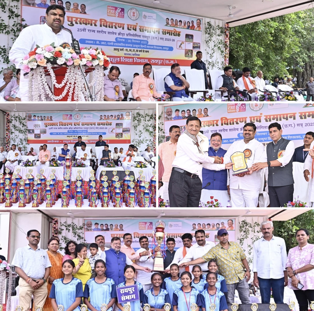 रायपुर, 30 सितम्बर2025 : राजधानी रायपुर स्थित जे. आर. दानी शासकीय कन्या उत्कृष्ट हिंदी माध्यमिक विद्यालय में आज 25वीं राज्य स्तरीय शाला क्रीड़ा प्रतियोगिता का समापन एवं पुरस्कार वितरण समारोह बड़े उत्साह और उल्लास के साथ सम्पन्न हुआ। इस अवसर पर स्कूल शिक्षा मंत्री श्री गजेंद्र यादव मुख्य अतिथि के रूप में शामिल हुए। चार दिनों तक चले इस आयोजन ने राज्यभर के विद्यार्थियों की प्रतिभा को एक मंच पर प्रस्तुत किया और विद्यालय प्रांगण खेल भावना तथा ऊर्जा से गूंज उठा।