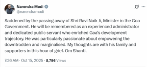 पीएम मोदी ने जताया दुःख – गोवा सरकार में मंत्री रवि नाइक के निधन से दुःख हुआ। उन्हें एक अनुभवी प्रशासक और समर्पित लोक सेवक के रूप में याद किया जाएगा जिन्होंने गोवा के विकास पथ को समृद्ध बनाया। वे विशेष रूप से वंचितों और हाशिए पर पड़े लोगों को सशक्त बनाने के लिए तत्पर थे। इस दुःख की घड़ी में मेरी संवेदनाएँ उनके परिवार और समर्थकों के साथ हैं। ॐ शांति।