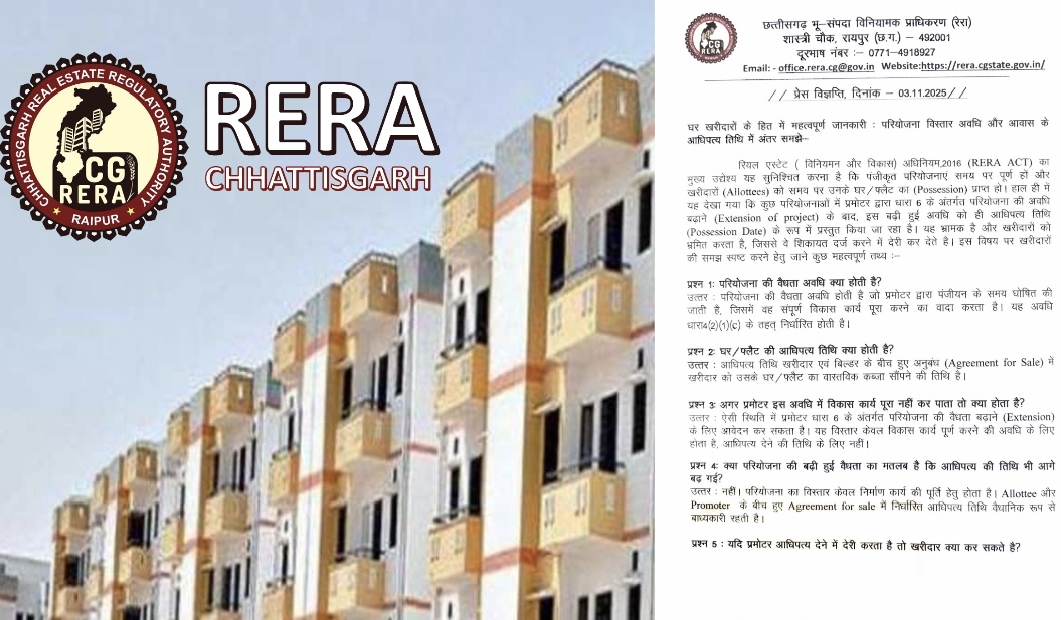 छत्तीसगढ़/रायपुर : छत्तीसगढ़ भू-संपदा विनियामक प्राधिकरण (रेरा) ने घर खरीदारों (Allottees) के हित में महत्वपूर्ण जानकारी जारी करते हुए स्पष्ट किया है कि किसी परियोजना की विस्तार अवधि (Extension Period) और आधिपत्य तिथि (Possession Date) दोनों में अंतर होता है। रेरा ने कहा है कि परियोजना की अवधि बढ़ाए जाने का अर्थ यह नहीं है कि खरीदार को संपत्ति देने की निर्धारित तिथि भी बढ़ गई है।