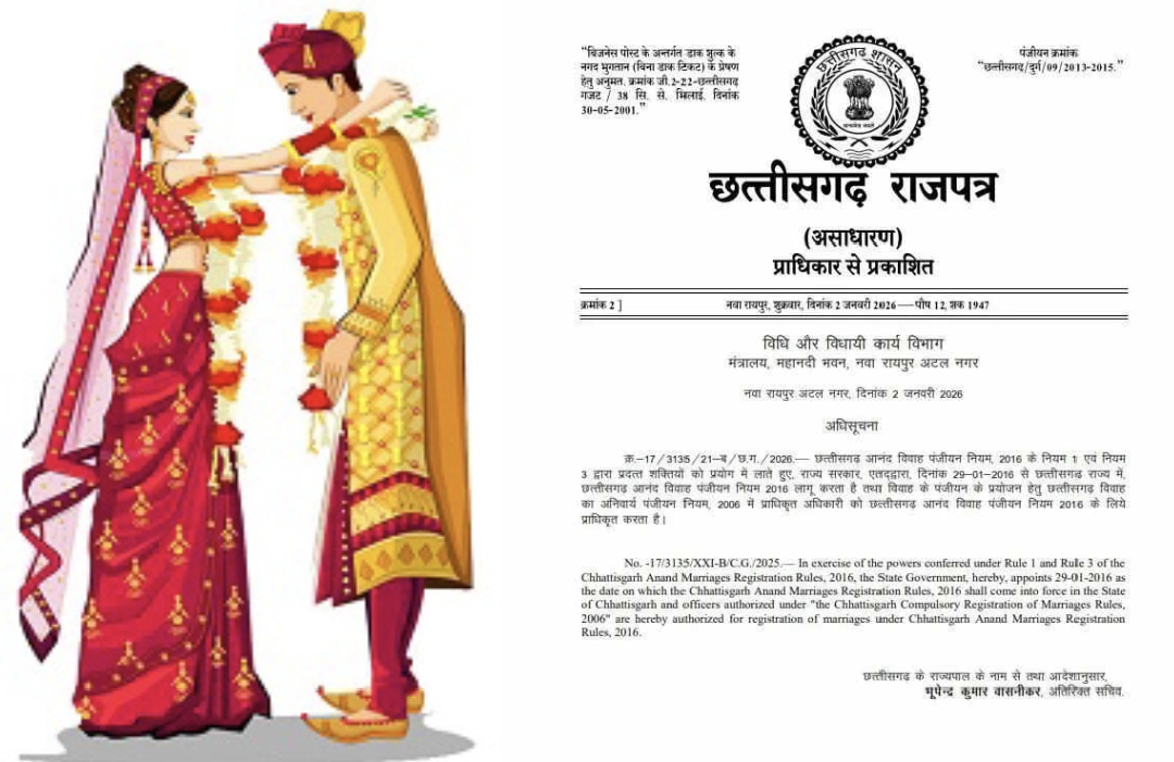 जारी अधिसूचना के अनुसार, ‘छत्तीसगढ़ आनंद विवाह पंजीयन नियम, 2016’ की शक्तियों का प्रयोग करते हुए राज्य सरकार ने यह स्पष्ट किया है कि प्रदेश में अब विवाह का पंजीकरण कराना कानूनी रूप से जरूरी होगा।