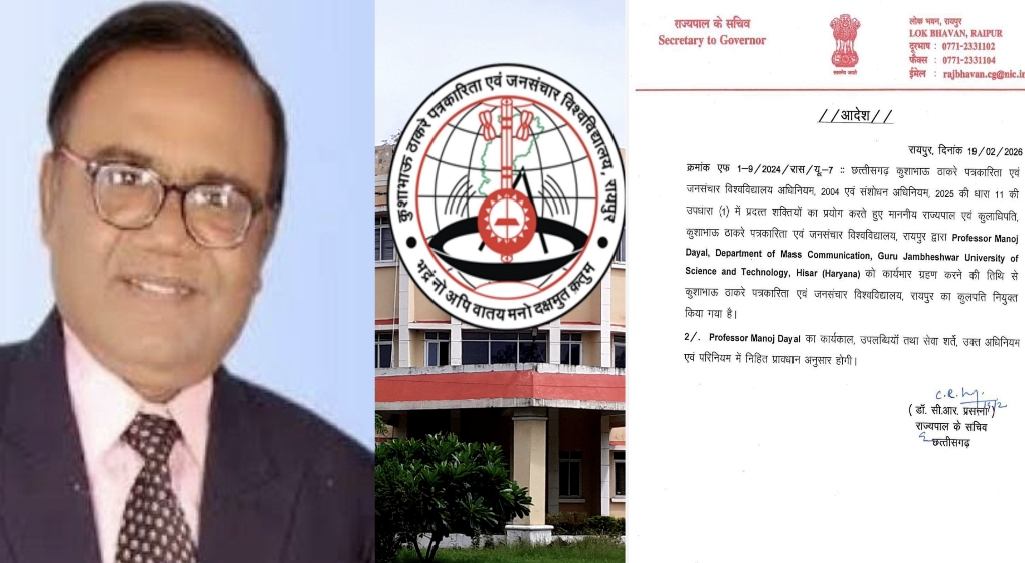 जारी आदेश में उल्लेखित है कि छत्तीसगढ़ कुशाभाऊ ठाकरे पत्रकारिता एवं जनसंचार विश्वविद्यालय अधिनियम, 2004 एवं संशोधन अधिनियम 2025 की धारा 11 की उपधारा (1) में प्रदत्त शक्तियों का प्रयोग करते हुए राज्यपाल एवं कुलाधिपति, कुशाभाऊ ठाकरे पत्रकारिता एवं जनसंचार विश्वविद्यालय, रायपुर द्वारा Professor Manoj Dayal, Department of Mass Communication, Guru Jambheshwar University of Science and Technology, Hisar (Haryana) को कार्यभार ग्रहण करने की तिथि से कुशाभाऊ ठाकरे पत्रकारिता एवं जनसंचार विश्वविद्यालय रायपुर का कुलपति नियुक्त किया गया है। प्रोफेसर मनोज दयाल का कार्यकाल, उपलब्धियां एवं सेवा शर्ते, उक्त अधिनियम एवं परिनियम में निहित प्रावधान अनुसार होगी।