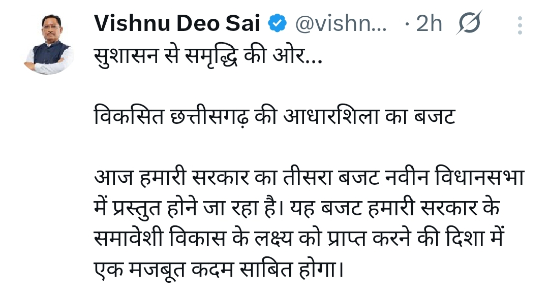यह बजट हमारी सरकार के समावेशी विकास के लक्ष्य को प्राप्त करने की दिशा में एक मजबूत कदम साबित होगा। माननीय प्रधानमंत्री श्री नरेंद्र मोदी जी के विकसित भारत 2047 के संकल्प को केंद्रित करते हुए हमारी सरकार विकसित छत्तीसगढ़ के निर्माण की दिशा में निरंतर कार्य कर रही है। किसानों, गरीबों, युवाओं, मातृशक्ति और आदिवासी समाज के सशक्तीकरण को हमने प्राथमिकता दी है। हमारा पूरा विश्वास है इस बजट से हमारे ‘सुशासन से समृद्धि’ के मॉडल को एक मजबूत आधार मिलेगा। निस्संदेह वित्त वर्ष 2026-27 के लिए प्रस्तुत होने वाला आज का बजट प्रदेश के विकास के लिए मील का पत्थर साबित होगा। हमारी सरकार ‘विकसित छत्तीसगढ़’ बनाने के अपने संकल्प पर दृढ़ है। आज के बजट से हमारे संकल्प को और बल मिलेगा। हमारा छत्तीसगढ़ आत्मनिर्भरता व समृद्धि के नए दौर में प्रवेश करेगा। शुभकामना।