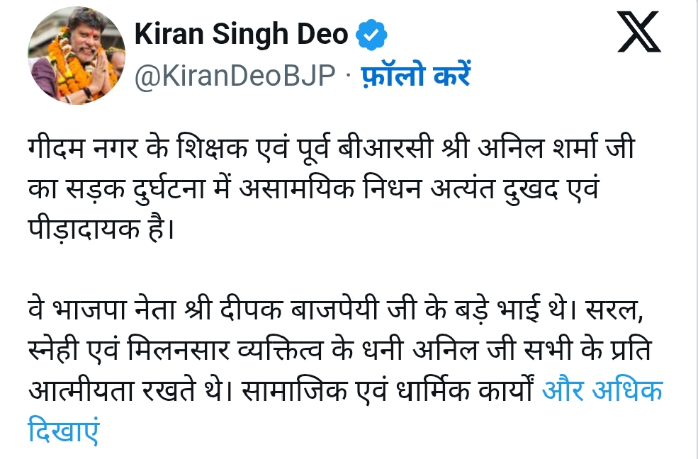 छत्तीसगढ़/जगदलपुर : सड़क हादसे में भाजपा नेता के शिक्षक भाई की मौत हो गए है, बीजेपी प्रदेश अध्यक्ष ने शोक जताते हुए लिखा, गीदम नगर के शिक्षक एवं पूर्व बीआरसी अनिल शर्मा का सड़क दुर्घटना में असामयिक निधन अत्यंत दुखद एवं पीड़ादायक है। वे भाजपा नेता दीपक बाजपेयी जी के बड़े भाई थे। सरल, स्नेही एवं मिलनसार व्यक्तित्व के धनी अनिल जी सभी के प्रति आत्मीयता रखते थे। सामाजिक एवं धार्मिक कार्यों में उनकी सक्रिय भागीदारी सदैव स्मरणीय रहेगी।ईश्वर से प्रार्थना है कि दिवंगत आत्मा को शांति प्रदान करें तथा शोकाकुल परिजनों को इस दुःख की घड़ी में संबल एवं धैर्य प्रदान करें।