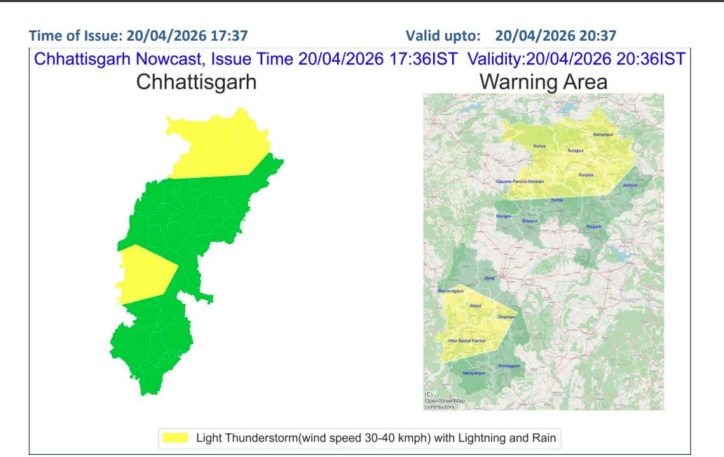 मौसम विभाग द्वारा जारी नाउकास्ट के अनुसार यह चेतावनी 5:36 बजे जारी की गई है, जो रात 8:36 बजे तक प्रभावी रहेगी। विभाग के मुताबिक छत्तीसगढ़ के नारायणपुर, कोंडागांव, उत्तर बस्तर कांकेर, धमतरी, बालोद, राजनांदगांव, रायगढ़, बिलासपुर, कोरबा, जशपुर, गौरेला-पेंड्रा-मरवाही, दुर्ग, मुंगेली, सरगुजा, सूरजपुर, कोरिया और बलरामपुर जिलों में मेघगर्जन, बिजली गिरने और तेज हवा के साथ बारिश होने की संभावना है।