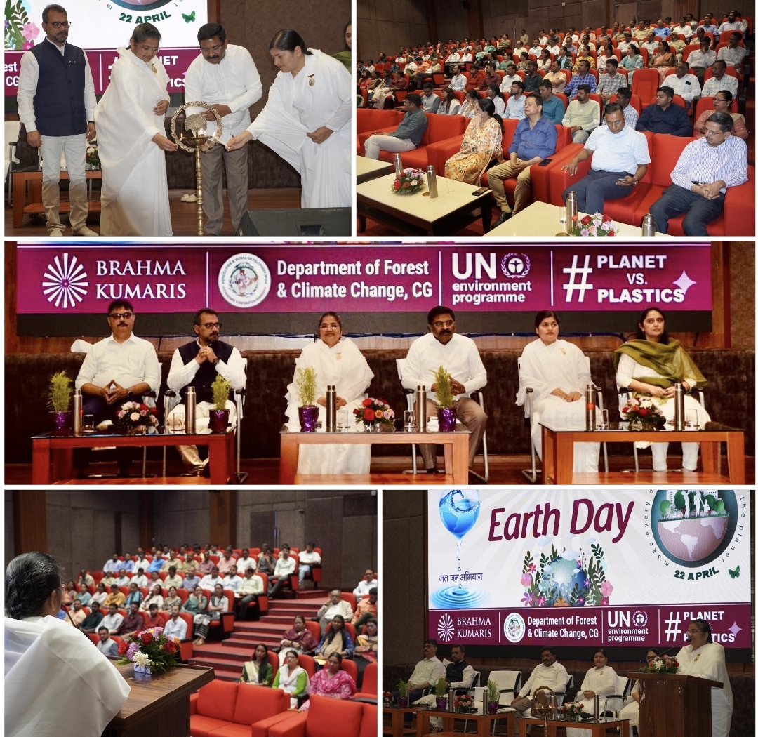 नवा रायपुर, 22 अप्रैल 2026: छत्तीसगढ़ शासन के वन एवं जलवायु परिवर्तन विभाग और प्रजापिता ब्रह्माकुमारी ईश्वरीय विश्व विद्यालय के ग्राम विकास प्रभाग द्वारा संयुक्त रूप से विश्व पृथ्वी दिवस पर नवा रायपुर स्थित अरण्य भवन में परिचर्चा आयोजित की गई जिसमें वन एवं जलवायु परिवर्तन विभाग के प्रधान मुख्य वन सरंक्षक एवं वन बल प्रमुख श्रीनिवास राव, प्रधान मुख्य वन सरंक्षक एवं मुख्य वन्यप्राणी सरंक्षक अरूण कुमार पाण्डे, ब्रह्माकुमारी सविता दीदी, रश्मि दीदी, अपर प्रधान मुख्य वन सरंक्षक (भूप्रबन्ध) सुनील कुमार मिश्रा, अपर प्रधान मुख्य वन सरंक्षक (प्रशासन) श्रीमती शालिनी रैना सहित बड़ी संख्या में लोगों ने हिस्सा लिया।