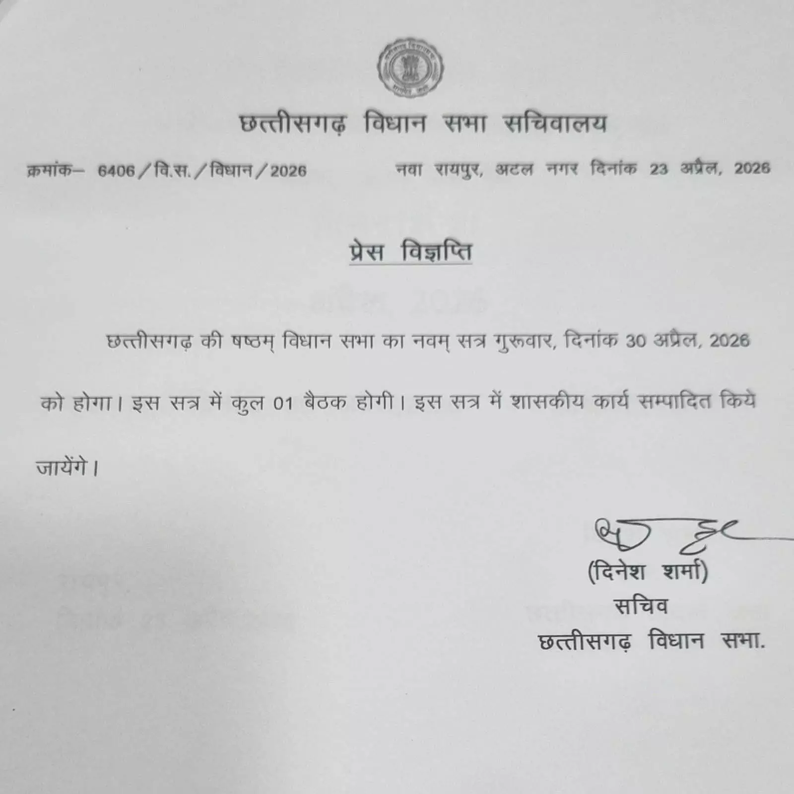 छत्तीसगढ़ विधानसभा का 30 अप्रैल को विशेष सत्र…