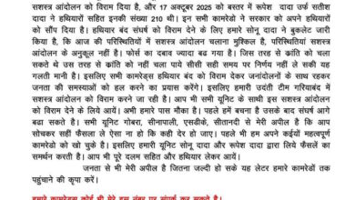 माओवादी एरिया कमांडर सुनील ने पत्र लिखकर नक्सली साथियों से कहा- हथियार छोड़, आत्मसमर्पण करें…